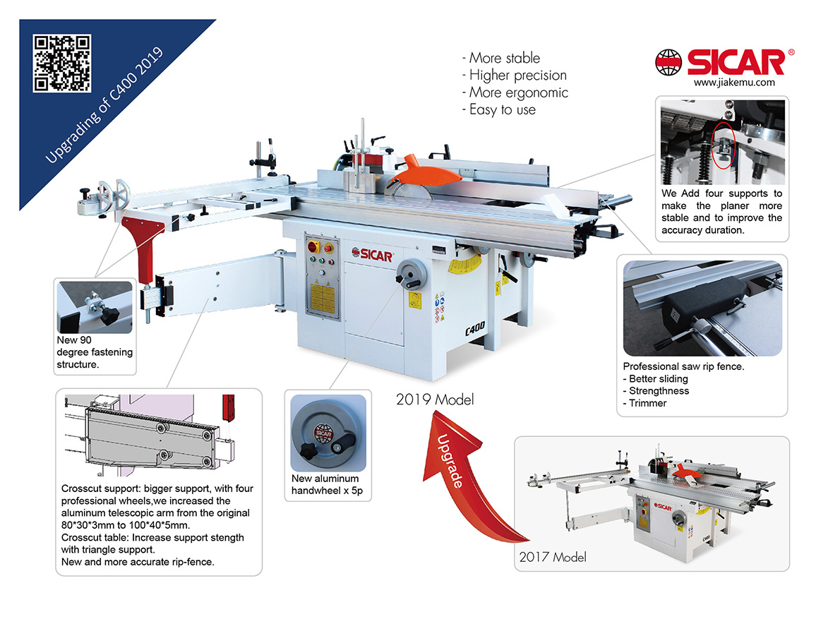 Le nostre Combinate C400 5L hanno un robusto telaio in lamiera di acciaio piegata ed elettrosaldata, verniciato a polveri interno ed esterno cotte a 200 gradi, piani in ghisa normalizzata di grosso spessore rettificata, tutto il materiale è certificato, montano 3 motori auto frenanti protetti singolarmente che, possono variare la potenza da 3hp,a 5,5hp secondo la richiesta. Il carro e di alluminio fresato e anodizzato di grosso spessore, può variare di lunghezza secondo il modello o le richieste, corre su sfere di acciaio e pista di acciaio, ed è regolabile sulla scorrevolezza. . Il toupie può avere l’albero di diametro voluto, ha 4 velocità di serie, la cuffia è di grosse dimensioni in pressofusione di alluminio regolabile su i due lati in maniera indipendente, le righe della cuffia sono in alluminio anodizzato e fresato sulla parte a contatto del legno e regolabili. Il gruppo sega è costruito in acciaio di grosso spessore montato su settori di materiale sinterizzato ed é inclinabile con volantino da 90° a 45° con battute regolabili, la lama della sega ha il diametro 300mm con foro 30mm il sollevamento della stessa è con leva ammortizzata. L’incisore è di serie e porta un diametro 90mm con foro 22mm, è regolabile sia in altezza sia verticalmente. Riga di taglio parallelo in alluminio anodizzato fresata su due lati, con doppia lettura. Riga per piallare indipendente di grosse dimensioni in alluminio anodizzato, fresata, inclinabile da 90° a 45° con lettura e regolazione di battuta. Riga per squadrare in alluminio anodizzato, fresata su due facce, allungabile fino a 3200mm con lettura regolabile in acciaio inossidabile e numeri incisi in nero, doppia battuta girevole di facile regolazione. Il piano di appoggio legno é costruito in tubolare elettrosaldato, ed è sorretto da una bandiera sfilabile con regolazione eccentrica. Tutte le prese di aspirazione sono di diametro di 120 mm.